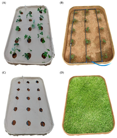 (A) Strawberry with recycled paper mulch (SWiP), (B) strawberry without recycled paper mulch (SWoP), (C) lysimeter only with recycled paper mulch (OPM), and (D) lysimeter cultivated with Bahiagrass (CBG).