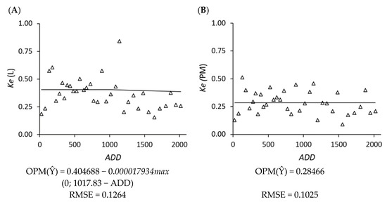 Soil water evaporation coefficient (Ke) obtained using only recycled paper mulch (OPM) as a function of accumulated degree-days (ADD), for the (A) lysimeter (L) and (B) Penman–Monteith (M) methods.