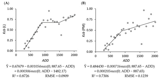 Basal crop coefficient (Kcb) of strawberry as a function of accumulated growing degree-days (ADD), after transplanting, using the (A) lysimeter (L) and (B) Penman–Monteith (PM) methods, with recycled paper mulch.