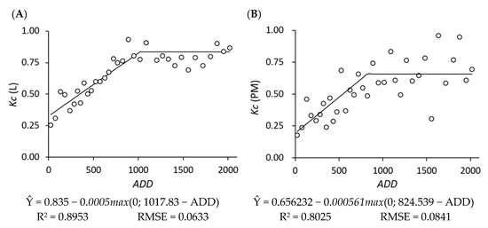 Crop coefficients (Kc) of strawberry cultivated with recycled paper mulch as a function of accumulated degree-days (ADD) and obtained using the (A) lysimeter (L) and (B) Penman–Monteith (PM) methods.