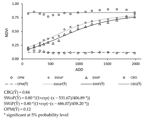 Normalized difference vegetation index (NDVI) in lysimeters cultivated with strawberry without recycled paper mulch (SWoP) and with recycled paper mulch (SWiP), lysimeter with only recycled paper mulch (OPM), and lysimeter with Bahiagrass (CBG) as a function of accumulated degree-days (ADD).