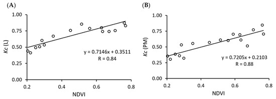 Relationship between the normalized difference vegetation index (NDVI) and Kc obtained for strawberry cultivated with recycled paper mulch (SWiP), using the (A) lysimeter (L) and (B) Penman–Monteith (PM) methods.