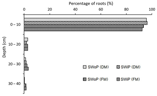 Percentage distribution of the root system along the soil profile for strawberry cultivated without recycled paper mulch (SWoP) and with recycled paper mulch (SWiP), for the fresh (FM) and dry (DM) mass of roots.