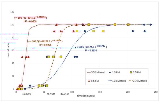 | The trend of mortality rates (y) by time elapsed after treatment in minutes (x) | |||||