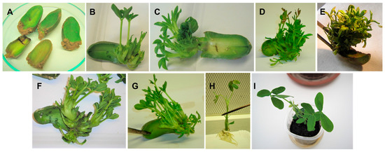 - Pestana, M.C.; Lacorte, C.; de Freitas, V.G.; de Oliveira, D.E.; Mansur, E. İn vitro Regeneration of Peanut (Arachis hypogaea L.) through Organogenesis: Effect of Culture Temperature and Silver Nitrate. Vitr. Cell Dev. Biol.-Plant 1999, 35, 214–216. [Google Scholar] [CrossRef]