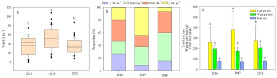 Actual apple yields and bearing features of orchards (n = 45) in 2016–2018 for Beiquan Village, Hebei, China. (a) Variations in the yield of farmers over three years. Box boundaries indicate upper and lower quartiles. The whisker caps indicate 90th and 10th percentiles, and the points indicate outliers. (b) The proportions of sampled orchards with a yield ≤ 20 t ha−1, 20–40 t ha−1, 40–60 t ha−1, and ≥60 t ha−1 in 2016–2018. Light purple indicates the actual yield was ≤20 t ha−1, light green indicates the actual yield was 20–40 t ha−1, orange indicates the actual yield was 40–60 t ha−1, and yellow indicates the actual yield was ≥60 t ha−1. (c) Bearing features of sample orchards in 2016–2018. Yellow indicates the load per tree, green indicates the single fruit weight, and blue indicates the size of the fruit.
