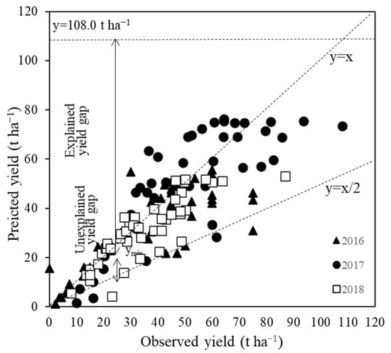 Observed yield against the minimum predicted yield using boundary line analysis during 2016–2018 (n = 45) for Beiquan Village, Hebei, China. The horizontal line y = 108.0 t ha−1 represents the maximum yield observed in 2017; the maximum yields in 2016 (75 t ha–1) and 2018 (87 t ha−1) are not shown. The upper arrow indicates the difference between the minimum predicted yield and maximum attainable yield (defined as the explainable yield gap). The lower arrow indicates the difference between the minimum predicted yield and the observed yield (defined as the unexplained yield gap) based on production constraints. The dotted diagonal lines representing 1:1 and 2:1 depict the relationships y = x and y = x/2, respectively.