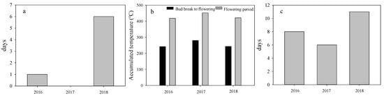 (a) Number of days when the average daily temperature was below 0 °C during the bud break period (March); (b) changes in accumulated temperature above 10 °C at key growth stages of apples in 2016–2018. The black square indicates the accumulated temperature above 10 °C from bud break to flowering (10 March–20 May), while the gray square indicates the accumulated temperature above 10 °C during the flowering period (1 April–31 May); and (c) number of days when the daily minimum temperature was below 0 °C from bud break to flowering (10 March–20 May).