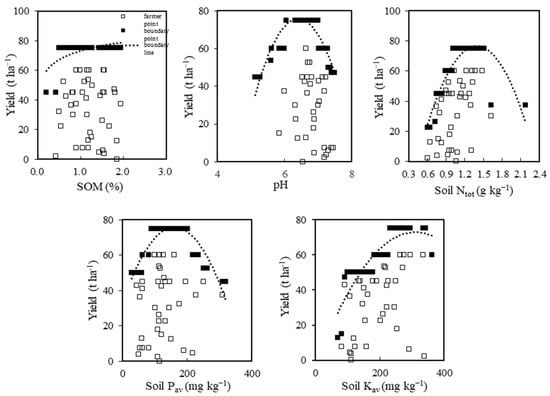 The boundary lines were established for production constraints significantly related to yield (p ≤ 0.05). Boundary lines were also established for other production conditions related to yield. For boundary points that showed positive relationships (i.e., soil organic matter), sigmoidal regression analysis was used [] as follows: