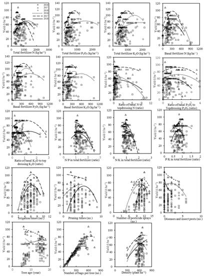 However, inconsistent threshold values were obtained for the other 10 management factors, including total nitrogen input, total phosphorus input, total potassium input, basal potassium input, N/P, ratio of basal-to-topdressing of nitrogen fertilizer, ratio of basal-to-topdressing of potassium fertilizer, pruning times, tree age, and density. For example, in 2017, the yield decreased when the total nitrogen input exceeded 600 kg ha−1, whereas in 2016 and 2018, the yield decreased when the total nitrogen input exceeded 1200 kg ha−1. The threshold value for N/P was 1 in 2017, whereas it was 1.4 in 2016 and 2018. The threshold value for the basal-to-topdressing ratio of potassium fertilizer was 0.6 in 2016, whereas it was 1.2 in 2017 and 2018. The threshold value for pruning times was 5–6 in 2016 and 2018, and 1 in 2017. The threshold value for density was 600 plants ha−1 in 2016 and 675 plants ha−1 in 2017; however, there was no threshold value for density in 2018. In addition, the tree age corresponding to the highest yield in different years did not show a particular pattern, which may be because only mature fruit trees were investigated in this study.