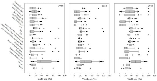 Explained yield gap for management limiting factors, expressed as a percentage of the attained maximum yield in 2016–2018, for Beiquan Village, Hebei, China. The box boundaries the indicate upper and lower quartiles, the whisker caps indicate 90th and 10th percentiles, and the points indicate the outliers.