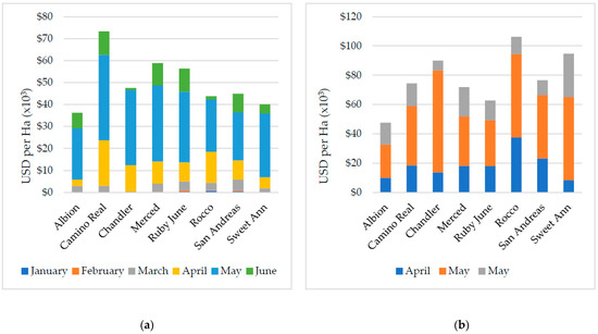 Gross revenues depended on cultivars, production environment, and marketing strategy. Figure 1 shows monthly revenue from each cultivar in the high tunnel (a) and open-field (b) for a pre-pick-wholesale price. ‘Camino Real’ generated the highest revenue in the high tunnel with annual revenue of $73,287 ha−1 ($29,659 ac−1), followed by ‘Merced’ and ‘Ruby June’ with gross revenues of $58,839 ha−1 ($23,812 ac−1) and $56,366 ha−1 ($22,811 ac−1), respectively. ‘Albion’ generated the lowest revenue of $36,578 ha−1 ($14,803 ac−1). In the open-field, ‘Rocco’ generated the highest revenue of $106,243 ha−1 ($42,996 ac−1) followed by ‘Sweet Ann’ and ‘Chandler’ with revenues of $94,715 ha−1 ($38,331 ac−1) and $89,925 ha−1 ($36,392 ac−1), respectively. Similar to the high tunnel result, ‘Albion’ generated the lowest revenue of $47,519 ha−1 ($19,231 ac−1).
