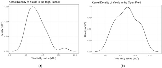 Kernel density estimates for high tunnel (a) and open-field yields (b).