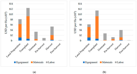 Estimated production costs in USD per hectare for every strawberry production stage in the high tunnel (a) and open-field (b). Labor for the ‘harvest production stage’ does not include labor for picking berries.