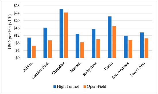 Net revenues per hectare from eight strawberry cultivars under each marketing strategy and under open-field and high tunnel production were estimated by subtracting the total per hectare cost from gross revenues.