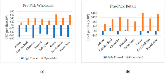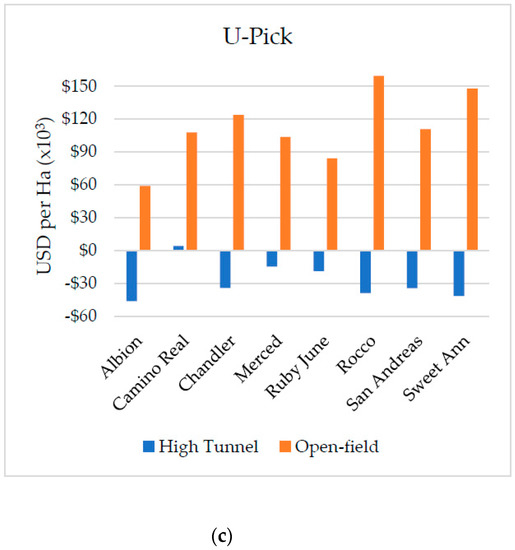 Similarly, when producers marketed their strawberries at a retail price (pre-pick retail) and when consumers picked the berries from the field (U-pick), all high tunnel cultivars generated a negative net return, except for ‘Camino Real’ and ‘Merced’. The net revenue from ‘Camino Real’ was $28,689 ha−1 ($11,610 ac−1) and $4295 ha−1 ($1738 ac−1) at pre-pick-retail and U-pick prices, respectively, and the net revenue from ‘Merced’ was $5338 ha−1 ($2160 ac−1) at the pre-pick retail price. In contrast, all open-field cultivars generated a positive return (Figure 5b,c and Table A3). In both marketing strategies, the loss from producing strawberries in the high tunnel was smaller than that incurred when berries were marketed at a wholesale price (pre-pick wholesale), but the difference between high tunnel and open-field net revenue became wider. On average, the per hectare net revenue from open-field cultivars exceeded that from the high tunnel by $127,253 ha−1 ($51,498 ac−1) for pre-pick retail and $109,788 ha−1 ($44,430 ac−1) for U-pick.