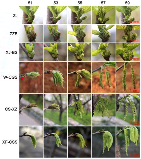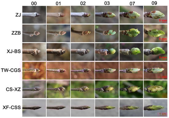 Cultivars differed considerably in their phenological growth stages, even intra-species. Therefore, we summarized a schematic representation showing the chronological progression of principal growth stages for the vegetative and reproductive phenology in the six mulberry cultivars (Figure 7). In stage 0, the bud development of ‘ZJ’ and ‘TW-CGS’ began at the third week of January and first week of February in winter, earlier than other mulberries, followed by ‘ZZB’ and ‘XJ-BS’. In contrast, the buds of ‘CS-XZ’ and ‘XF-CSS’ developed much later than the above mulberries, starting in mid-March and continuing for 12–13 days. Despite 2–3 week inter-year shifts in dates of bud development onset, the order of bud development in different cultivars remained constant (Figure 7). The order of leaf and shoot development (stages 1 and 3) in different cultivars were consistent with bud development. In stage 3, shoot development began with shoot emergence and ended with abortion and abscission of apical meristems of the long shoots, which further provided evidence of the temperate origin of mulberry (Figure 7).