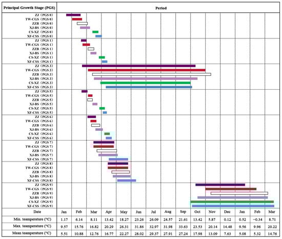 Schematic representation of the growth stages for six mulberries (data gathered from 2021 to 2022). The purple rectangle represents the ‘ZJ’; the red rectangle represents the ‘TW-CGS’; the white rectangle represents the ‘ZZB’; the pink rectangle represents the ‘XJ-BS’; the green rectangle represents the ‘CS-XZ’; the blue rectangle represents the ‘XF-CSS’.
