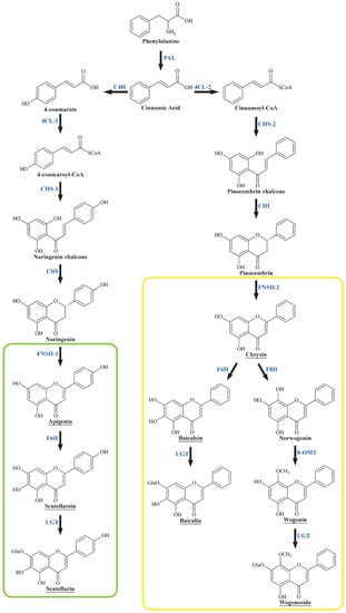 - Zhao, Q.; Zhang, Y.; Wang, G.; Hill, L.; Weng, J.-K.; Chen, X.-Y.; Xue, H.; Martin, C. A specialized flavone biosynthetic pathway has evolved in the medicinal plant, Scutellaria baicalensis. Sci. Adv. 2016, 2, e1501780. [Google Scholar] [CrossRef] [PubMed]