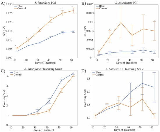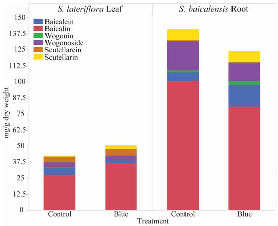 Impact of Blue Light on Plant Growth, Flowering and Accumulation of Medicinal Flavones in Scutellaria baicalensis and S. lateriflora