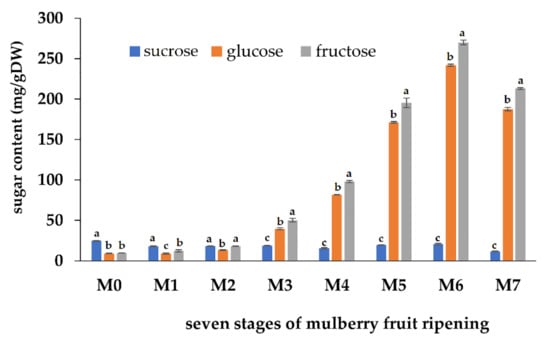 Sugar content in mulberry fruit during different ripening stages. Values are expressed as mean ± SD of triplicate measurements (n = 3). M0–M7 are mulberry fruits during ripening stages; means with different letters (a, b, c) are significantly different at p < 0.05.