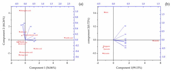 The PCA score plot of phenolic acid content and ripening stages was separated into different blocks and responsible for 54.86% and 44.26% of the total variance of PCA1 and PCA2, respectively (Figure 3a). Furthermore, the ripening stages were variable vectors (seven ripening stages: M0–M7) placed at a slight distance from one another, indicating a strong correlation between them. In addition, M0, M1 and M2 were correlated with the contents of gallic acid, p-hydroxybenzoic acid and chlorogenic acid, while M3, M4, M5, M6 and M7 were correlated with the content of vanillic acid and caffeic acid. This indicates that the content of individual phenolic acids relates to the formation of phenolic acids at different stages, which is similar to a previous study reporting that the first stage of ripening is the initial synthesis of phytochemical compounds and the next stage of ripening changes chemical compounds in mulberry fruits during maturation [47].