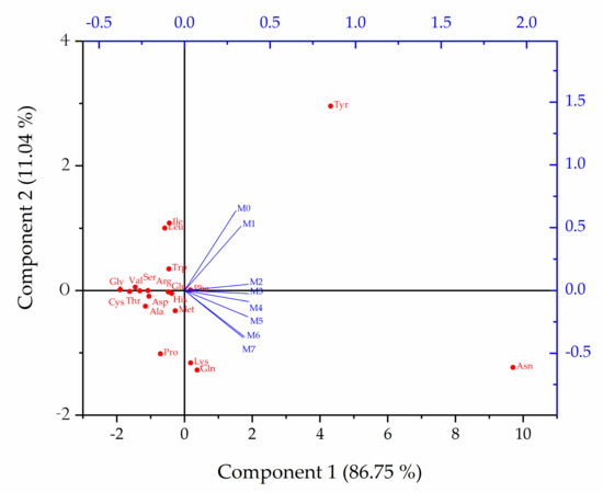 PCA score plot of amino acids. M0−M7 are mulberry fruits during ripening stages. Ala: alanine; Arg: arginine; Asn: asparagine; Asp: aspartic acid; Cys: cysteine; Gln: glutamine; Glu: glutamic acid; Gly: glycine; His: histidine; Ile: isoleucine; Leu: leucine; Lys: lysine; Met: methionine; Phe: phenylalanine; Pro: proline; Ser: serine; Thr: threonine; Trp: tryptophan; Tyr: tyrosine; Val: valine.