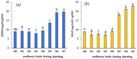 Changes in antioxidant activities measured by means of DPPH radical scavenging (a) and FRAP analyses (b) of mulberry fruit during different ripening stages. M0–M7 are mulberry fruit during different ripening stages; means with different letters (a–g) are significantly different at p < 0.05 within the same column.