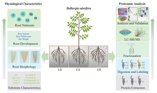 With increasing afforestation, the focus has shifted to drought, alpine, karst rocky desertification, and other difficult sites. In addition, recent de novo sequencing of D. odorifera at the chromosome level by Hong et al. [2] revealed its genomic information, which provides a basis for studying the important economic characteristics of D. odorifera at the molecular level. In this study, the basic properties of the substrate and plant were first studied. Furthermore, protein sequences annotated by genome were used as the database, and a comprehension proteomic analysis based on LC-MS/MS was applied to analyze the protein abundance differences in the root tips of D. odorifera seedlings under different substrate conditions. The workflow of physiological and proteomic studies of D. odorifera in different substrates are shown in Figure 1. The purpose of the study was to discover potential functional proteins related to the root growth of D. odorifera seedlings and to provide a technical reference and theoretical basis for strong seedling cultivation (breeding) and popularization of D. odorifera at the molecular level.