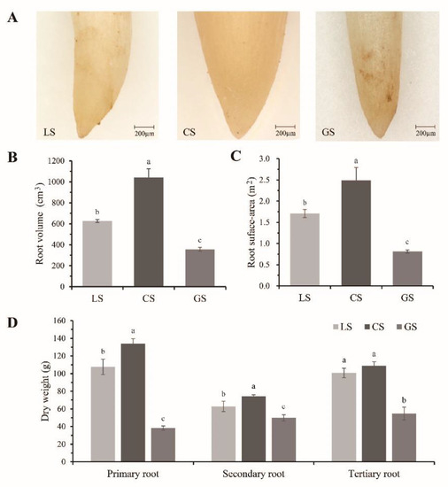 Root tip development of D. odorifera under three growth substrates: (A) the representative morphology of root tip; (B) total root volume of plants; (C) total root surface area of plants; and (D) dry weight of primary root, secondary root, and tertiary root of plants. LS: loam substrate, CS: composite substrate (50% gravel), and GS: gravel substrate (100% gravel). Error bars represent the SD of the mean. Different lowercase letters indicate a significant difference with the p value < 0.05.