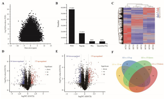 Summary statistics of the differential proteomics: (A) distribution of peptide mass error; (B) distribution of total protein. PSM: peptide-spectrum matches, PGs: protein groups; (C) the cluster heatmap of all quantitative protein abundance levels. Blue represents an abundance level below the mean, and red represents an expression level above the mean; (D) the volcanic plot of the LS vs. CS comparison group; (E) the volcanic plot of the GS vs. CS comparison group (Blue: downregulated; Red: upregulated; Black: no difference); and (F) Venn diagram of the two comparison groups.
