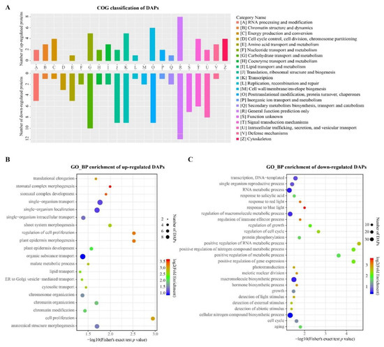 Functional annotation and enrichment analysis of the overlapped differentially accumulated proteins (DAPs): (A) clusters of orthologous genes (COG) classification of overlapped DAPs; (B) gene ontology_biological process (GO_BP) enrichment analysis of overlapped upregulated proteins (URPs); and (C) GO_BP enrichment analysis of overlapped downregulated proteins (DRPs).