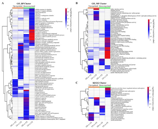 In order to analyze the variation in characteristics and potential functions of the DAPs under different substrate conditions, we performed cluster analysis of these proteins based on enrichment of the GO and KEGG functions. Cluster analysis of enriched gene ontology_biological process (GO_BP) functional terms showed that specific URPs in the comparison of LS vs. CS were mainly enriched in process clusters including organic substrate metabolism, ATP metabolism, carbohydrate metabolism, root hair cell differentiation, endogenous metabolism, and response to metal ions. The specific DRPs in the LS substrate relative to CS were mainly concentrated in process clusters such as regulation of RNA metabolism and gene expression, response to stimulation, and signal transduction. However, the enriched processes of specific URPs in the comparison of GS vs. CS were mainly clustered to hydrogen peroxide metabolism, fatty acid biosynthesis, lipid metabolism, and seed development. The enriched processes of specific DRPs were mainly clustered to lipid transport, response to multiple sugars, cell wall biosynthesis, and biological processes such as DNA modification (Figure 5A). Specifically, the abundance of a large number of cell wall-related proteins, such as expansins and endoglucanases, appeared in the GO term of cell wall biosynthesis. Cluster analysis of enriched gene ontology_molecular function (GO_MF) functional terms showed that the specific URPs were mainly clustered in amylase, oxidoreductase activity, catalytic activity, and GAPDH activity, and that the specific DRPs were mainly clustered in kinase activity nucleic acid binding, ATP binding, and ubiquitin molecular binding in the comparison of LS vs. CS. In contrast, the enriched biological processes of specific URPs were mainly clustered to malate dehydrogenase and coenzyme A carboxylase, and the enriched molecular functions of specific DRPs were mainly clustered to transferase activity and phosphatase activity in the comparison of GS vs. CS (Figure 5B). Furthermore, enrichment-based cluster analysis of the KEGG pathway indicated that the specific URPs in the comparison of LS vs. CS were gathered in the metabolic pathway, carbohydrate digestion and absorption, starch and sucrose metabolism, anthocyanin metabolism, and HIF-1 signaling pathway, while specific DRPs were enriched in base excision repair, mineral absorption, lysosome, and other KEGG pathways. In comparison, the enriched pathways were clustered in fatty acid metabolism, pyruvate metabolism, biotin metabolism, and secondary metabolite synthesis of specific URPs, and the enriched pathways were clustered in fatty acid elongation, the calcium signaling pathway, and the phosphatidylinositol signaling pathway of specific DRPs in GS vs. CS (Figure 5C).
