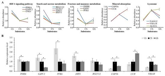Based on the proteomic results, proteins related to air permeability, glucose metabolism, and heat conduction were significantly regulated by substrate containing gravel. Three proteins (pyruvate dehydrogenase E1 component subunit alpha (PDHA), glyceraldehyde-3-phosphate dehydrogenase (GAPC2), and enolase (ENO1)) annotated to the HIF-1 signaling pathway, five proteins (probable fructokinase-6 (PFK6), β-glucosidase 12 (BGLU12), endoglucanase 17 (GUN17), α-amylase (AMY1), and β-amylase (BMY1)) annotated to starch and sucrose metabolism, and three proteins (putative 3,4-dihydroxy-2-butanone kinase (DHBK), putative GDP-L-fucose synthase 2 (GER2), and PFK6) annotated to fructose and mannose metabolism were downregulated in the CS and GS substrates as compared to the LS substrate, while two proteins including copper transporter 6 (COPT6) and copper transport protein (CCH)) associated with mineral absorption and three proteins including α-N-acetylglucosaminidase (NAGLU), V-ATPase subunit H (VAH-H) and thiol protease aleurain-like (ALEUL) associated with lysosome were upregulated in the CS substrate as compared to the LS substrate (Figure 6A). Eight of these proteins were verified by RT-qPCR analysis. Except for BGLU12, the mRNA expression trends of the remaining seven genes (PDHA, GAPC2, PKF6, AMY1, COPT6, CCH and VHA-H) were consistent with the proteomic results (Figure 6B). These results indicated that substrate containing gravel was related to hypoxic stress. Multiple processes in glucose metabolism were restrained, but the process of mineral absorption and lysosome may have been promoted.