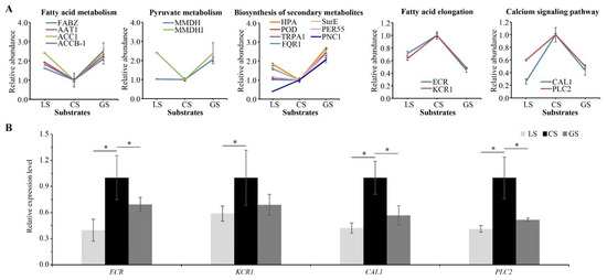 Based on the proteomic results, we also found that proteins related to nutrient metabolism and secondary metabolism were significantly regulated by substrate containing gravel. Four proteins (3-hydroxyacyl-[acyl-carrier-protein] dehydratase (FABZ), acetyl-CoA acetyltransferase (AAT1), Acetyl-CoA carboxylase 1 (ACC1), biotin carboxyl carrier protein of acetyl-CoA carboxylase (ACCB-1)) annotated to fatty acid metabolism, five proteins (AAT1, ACC1, ACCB-1 and two malate dehydrogenases (MMDH, MMDHI) annotated to pyruvate metabolism, and another seven proteins (histidinol-phosphate aminotransferase (HPA), peroxidase 15 (POD), peroxidase 55 (PER55), tryptophan synthase alpha chain (TRPA1), NAD(P)H dehydrogenase (FQR1), 5′-nucleotidase (SurE) and cationic peroxidase 1 (PNC1)) annotated to biosynthesis of secondary metabolism were downregulated in the CS substrate as compared to the GS substrate. Two proteins including very-long-chain enoyl-CoA reductase (ECR) and very-long-chain 3-oxoacyl-CoA reductase 1 (KCR1) associated with fatty acid elongation and two proteins including calmodulin (CAL1) and phosphoinositide phospholipase C 2 (PLC2) associated with the calcium signaling pathway were upregulated in the CS substrate as compared to the LS and GS substrates (Figure 7A). Six of these proteins were verified by qRT-PCR analysis. The expression trend of four proteins was consistent with the proteomic results (Figure 7B). These results indicated that the substrate containing gravel is related to nutrition stress. Multiple processes in fatty acid metabolism, pyruvate metabolism, and biosynthesis of secondary metabolites were restrained, but the process of fatty acid elongation and the calcium signaling pathway might been promoted in CS substrate.