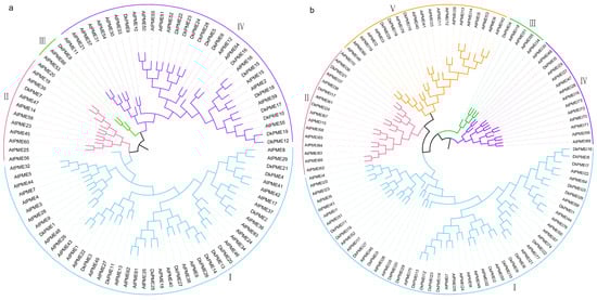NJ phylogenetic trees were constructed to verify the evolutionary relationship using the protein sequences of 66 published AtPMEs, 78 AtPMEIs, and putative DkPMEs and DkPMEIs (Figure 1). According to sequence similarity, the PMEs and PMEIs families in D. kaki were divided into 4 and 5 clades, respectively. The Type-II DkPME PMEs were clustered into Clade II, III, and IV, while Clade I only contained Type-I DkPMEs. The largest subfamily of PME was Clade IV which had 14 DkPME proteins, while Clade I, II, and III held 12, 1, and 1 DkPME genes, respectively (Figure 1a). As for the DkPMEI family, CladeI contained 21 proteins, while Group III and IV only contained 1 PMEI protein (Figure 1b).