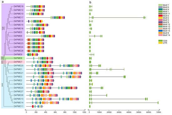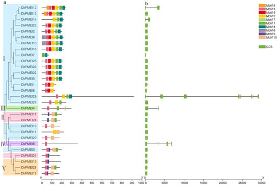 Conserved motif and gene structure analyses of PME genes in D. kaki. (a) Conserved motif distribution. (b) Exon–intron structure of DkPME genes.