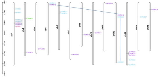 Chromosome location of DkPME genes in D. kaki. Genes of different groups are expressed in different colors. Darkblue lines showed fragment duplication events, and gray boxes presented tandem duplication events.
