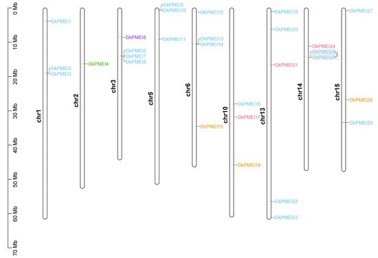Chromosomal localization analysis showed that DkPME and DkPMEI genes were distributed unevenly on their corresponding chromosomes (Table S1, Figure 4 and Figure 5). DkPME and DkPMEI genes were identified in 13 and 9 of 15 D. kaki chromosomes, respectively (Table S1, Figure 4 and Figure 5). For the DkPMEs, there were three gene clusters (DkPME3-DkPME4, DkPME5-DkPME6-DkPME7, DkPME22-DkPME23-DkPME24), respectively, located on chromosomes 1, 1, 13 (Figure 4). Of the DkPMEIs, there were four gene clusters (DkPMEI6-DkPMEI7-DkPMEI8, DkPMEI9-DkPMEI10, DkPMEI13-DkPMEI14, and DkPMEI25-DkPMEI26) located on chromosomes 3, 5, 6 and 14, respectively (Figure 4).