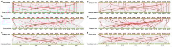 Synteny analysis of PME and PMEI genes between D. kaki, D. oleifera, and D. lotus, and A. thaliana. (a) PME genes between D. kaki and D. oleifera. (b) PME genes between D. kaki and D. lotus. (c) PME genes between D. kaki and A. thaliana. (d) PMEI genes between D. kaki and D. oleifera. (e) PMEI genes between D. kaki and D. lotus. (f) PMEI genes between D. kaki and A. thaliana.
