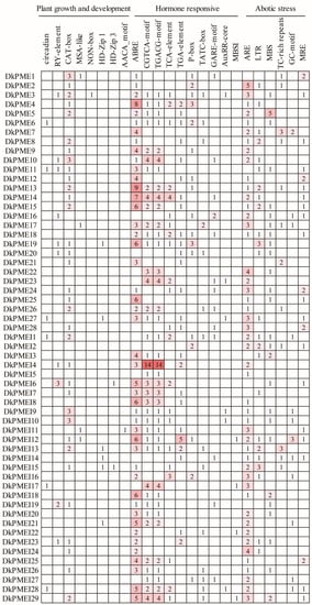 To investigate the gene characteristics and function of DkPME and DkPMEI genes, cis-regulatory elements in the promoters were predicted using PlantCARE. Briefly, multiple light-related elements were identified, namely Box 4, G-box, GT1-motif, TCT-motif, GATA-motif, and so on. Other cis-elements could be categorized into plant growth and development, hormone-responsive, and abiotic stress. Eight cis-elements were involved in plant growth and development, including circadian, MSA-box, CAT-box, RY-element, etc. Ten cis-elements are related to hormone-responsive, i.e., ABRE, TATC-box, CGTCA-motif, AuxRR-core, and P-box. Six cis-elements participated in abiotic stress (e.g., LTR, ARE, and MBS). In addition, the MBSI cis-element was involved in flavonoid biosynthetic genes regulation and was identified in the promoter of DkPMEI12, DkPMEI17, DkPMEI22, and DkPMEI29 (Figure 7 and Table S3).