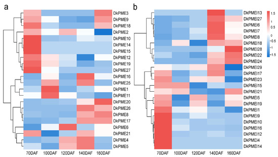 The expression levels of DkPME and DkPMEI genes during fruit development were evaluated using high-throughput RNA-seq data (Figure 8). Overall, 22 DkPME and 23 DkPMEI genes were expressed in persimmon during fruit development. Seven DkPME and eight DkPMEI genes exhibited constitutive expression (FPKM > 1 in all tested developmental stages), showing an indispensable role of DkPME and DkPMEI genes during fruit development. Six DkPME genes from clade IV were highly expressed at 70 DAF, suggesting that these genes might be associated with fruit growth. Three DkPMEs and two DkPMEIs were highly expressed in 160 DAF, including DkPME8, DkPME9, DkPME20, DkPMEI22, and DkPMEI24. Therefore, these genes might have essential roles in fruit maturation. Moreover, some DkPMEs and DkPMEIs from the same clade exhibited diverse expression patterns. For example, the expression of 7 DkPMEI genes from clade I peaked at 140 DAF, whereas 8 DkPMEI genes, also from clade I, expressed highly at 70 DAF, indicating that these PMEI genes might have diverse functions.