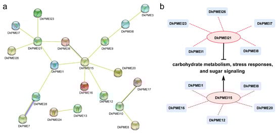 To analyze the function of DkPMEs and DkPMEIs, the protein–protein interaction network was constructed using the STRING database according to A. thaliana homologous proteins (Figure 9a). As a result, DkPMEI21 and DkPMEI15 were prominent core nodes in this interaction network. The protein sequence of DkPMEI21 was highly similar to that of AtPMEI10, a negative transcriptional regulator related to carbohydrate metabolism, stress responses, and sugar signaling. Furthermore, the sequence of DkPMEI15 was homology to that of AtPMEI78, a crucial transcriptional activator related to carbohydrate metabolism, stress responses, and sugar signaling with a positive regulatory function. DkPMEI21 and DkPMEI15 were closely related to DkPMEI1 and DkPMEI8, which may form a solid interaction network (Figure 9b).