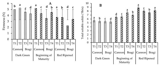Variation in firmness (A) and total soluble solids (B) at different ripening stages in greenhouse-grown bell pepper. Different letters on each bars indicate significant differences (p ≤ 0.05).