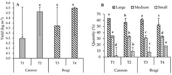 In addition, T1 on ‘Cannon’ reached 63% of fruits for foreign market (large size), 35% for domestic market (medium size fruits) and 2% fruits for local market (small fruits) (Figure 2). Ref. [] obtained 89% fruits for export, 4.39% for domestic market and 5.65 laggard fruits. Ref. [] obtained 75% of first-class fruits for export on CV Anaconda grown on a macro tunnel system.