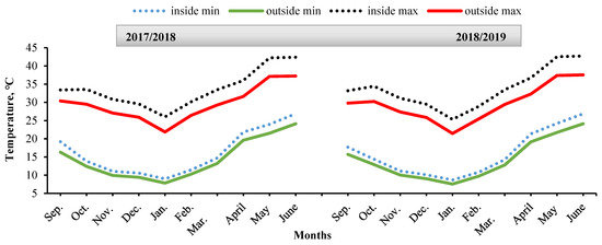 Maximum and minimum temperature for the inside and outside of the plastic greenhouse during the seasons of 2017/2018 and 2018/2019.