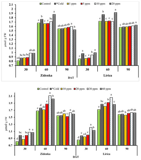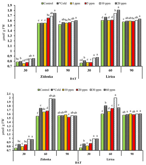 At 60 DAT, proline content jumped to almost three times more than that at 30 DAT, then slightly decreased at 90 DAT (Figure 2 and Figure 3). The proline content in Lirica leaves was significantly higher than that in Zidenka leaves. Lirica leaves had the highest proline content under 20 or 30 ppm ozone in the first and second season, respectively. Chilling tolerance pretreatment significantly affected leaf proline content at all sampling dates (30, 60, and 90 DAT) in both seasons. Proline content increased gradually as O3 concentration was increased to 30 or 60 ppm. At all tested sampling dates in both seasons, cold pretreatment ranked second, whereas the control recorded the lowest value. Seedling spray was better than seed soaking at 30 DAT, increased from 0.806 to 1.645 and from 0.874 to 0.993 μmol g−1FW in the first and second season, respectively, with increases from 0.911 to 1.75 and from 1.761 to 1.874 μmol g −1 in the first and second season, respectively, at 60 DAT, whereas the differences were not statistically detectable at 90 DAT.