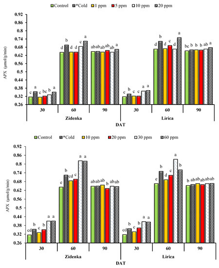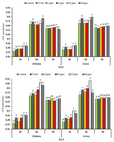 According to the data shown in Figure 4 and Figure 5, APX almost doubled 60 days after transplanting compared to after 30 days, then slightly decreased after 90 days. Data indicate that ozone and cold pretreatments had a significant impact on APX activity in both hybrid leaves at all tested sample dates during both growing seasons. In general, Lirica leaves had the highest APX activity when treated with higher ozone-induced concentrations. However, the Zidenka control had the lowest values. APX activity increased with increasing ozone concentration and reached the maximum value in Lyrica leaves with 20 or 30 ppm O3 (in the first and second season, respectively). The cold treatment resulted in intermediate values between the higher concentrations of ozone and the control. With respect to the application method, it was found that APX activity was significantly higher when seedlings were sprayed by ozone than when the seeds were soaked in ozonated water at a young plant age 30 and 60 days after transplanting. The enzyme activity increased from 0.333–0.362 to 0.378–0.412 μmol min−1g at 30 DAT and from 0.683–0.731 to 0.731–0.778 μmol min−1g at 60 DAT in the first and second season, respectively. However, the differences were not statistically detectable at 90 DAT in either growing season.