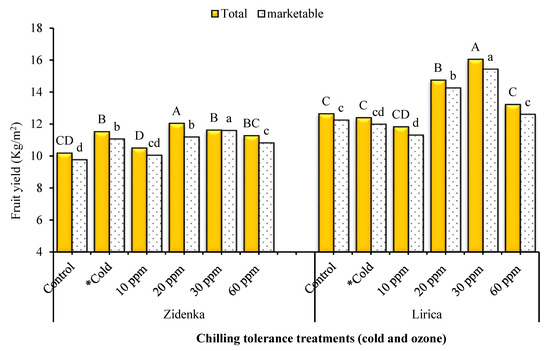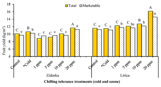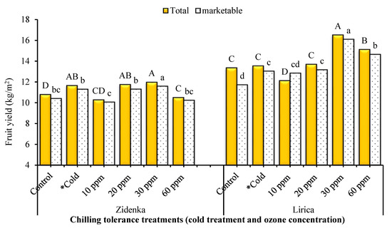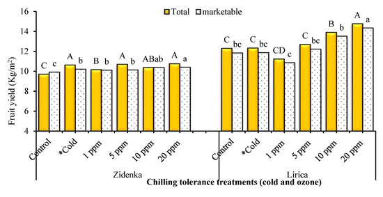 Effect of seed soaking in different ozonated water concentrations and cold pretreatments on total and marketable fruit yields of two sweet pepper hybrids during the 2017/2018 (upper figure) and 2018/2019 (lower figure) seasons. The columns labeled with different letters with in the same case are significantly different according to Duncan’s multiple range test at 0.05 levels. * Cold stress treatment was performed at 4 °C for 36 h.