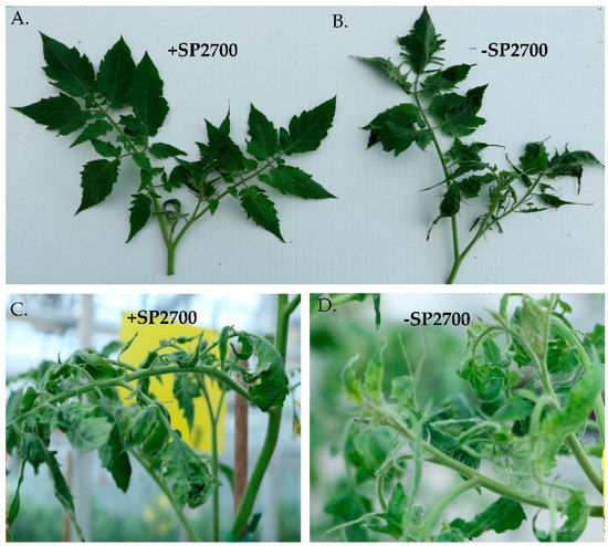 Symptom expression on tomato ‘Paipai’ plants that were pretreated with or without SP2700 upon inoculation with ToBRFV. (A) A tomato plant with pre-treatment with SP2700 showed normal appearance 3 weeks post inoculation (wpi) with ToBRFV. (B) A tomato plant without SP2700 pre-treatment displayed mottling and narrow leaves 3 wpi (right). (C) Symptom expression on ToBRFV-infected tomato plants that were pre-treated with SP2700 at 6 wpi. (D) +Symptom expression on ToBRFV-infected tomato plants without SP2700 pre-treatment at 6 wpi.